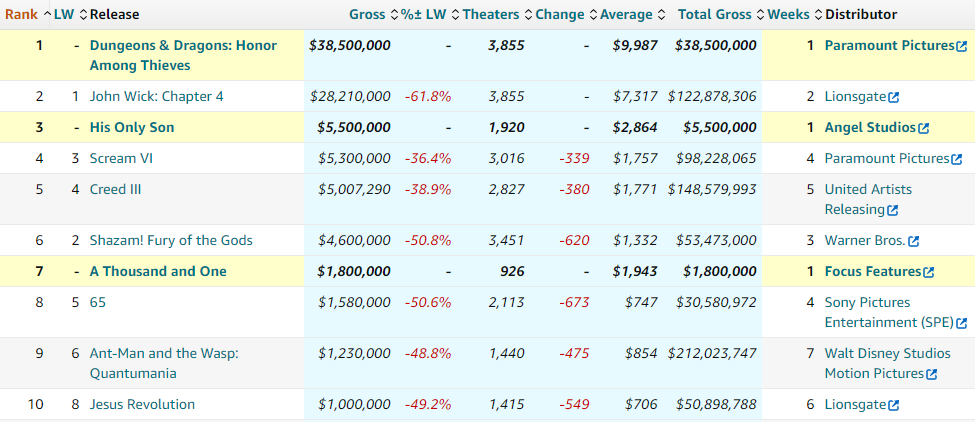 游戏改编电影《龙与地下城:侠盗荣耀》首映开门红,登上最新一期北美周末票房排行榜榜首。据票房统计网站boxofficemojo 4月2日发布的电影市场数据,26部影片北美周末票房(3月31日至4月2日)报收约9680万美元,与前一周末相比下滑约16%。《龙与地下城:侠盗荣耀》首映周末票房进账约3850万美元,加上海外市场,该片迄今总票房约7150万美元。