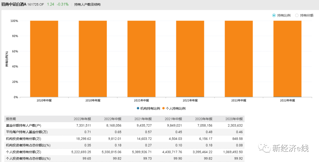 作为一只行业被动指数基金,招商中证白酒的持有人主要为个人投资者。据招商中证白酒3月30日披露的2022年年报显示,报告期末,招商中证白酒指数A和招商中证白酒指数C的持有人户数分别为733.1511万户和96.6507万户,户均持有的基金份额分别为7148.58份和7197.17份。