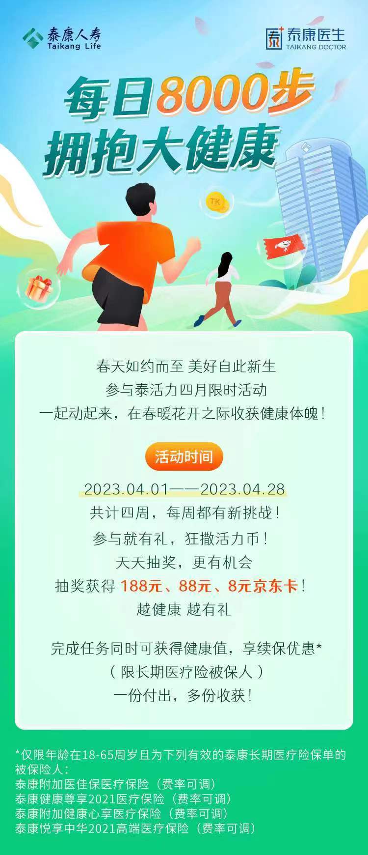 泰康人寿4月发起主题为“每天8000步,拥抱大健康”的健步走活动,所有泰康医生APP用户均可通过泰活力计划报名参加。