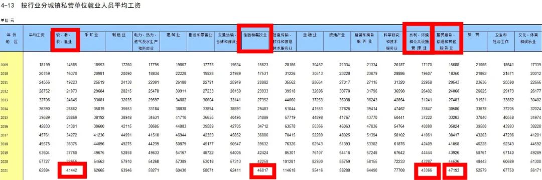 根据国家统计局编《中国统计年鉴2022》数据,按行业私营单位就业人员中,平均工资垫底的,全部是以体力活工作为主的行业。