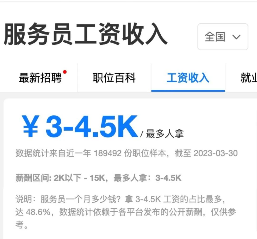 职友集近一年189492份职位样本数据显示,全国服务员收入占比最大的区间,是3000-4500元,占比达48.6%。