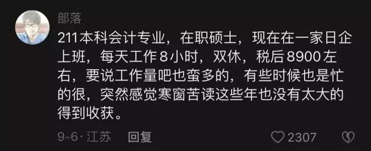 “211本科会计专业,在职硕士,现在在一家日企上班,每天工作8小时,双休,税后8900左右。突然感觉寒窗苦读这些年,也没有得到太大的收获。”