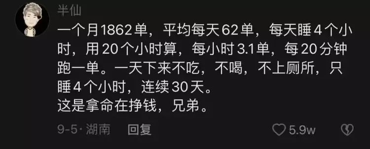 一万二的月薪背后,是外卖小哥一个月跑了1862单的拼命,是平均每天62单,每天只睡4小时,不吃不喝不上厕所跑20个小时,连续跑30天的点滴血汗。