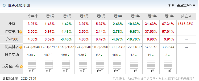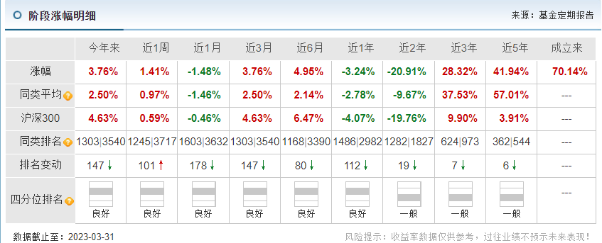 从一季度收益率表现看,富国天惠成长的收益率涨幅为3.76%,涨幅超过同类平均的2.5%,但仍低于沪深300的4.63%涨幅。
