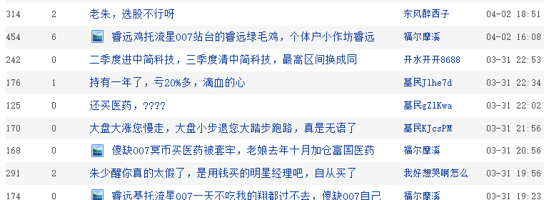 在天天基金网贴吧,有基民吐槽称,“持有一年了,亏20%多”;还有基民称,“老朱,选股不行呀”、“还买医药?”等吐槽,主要质疑基金经理的选股能力。