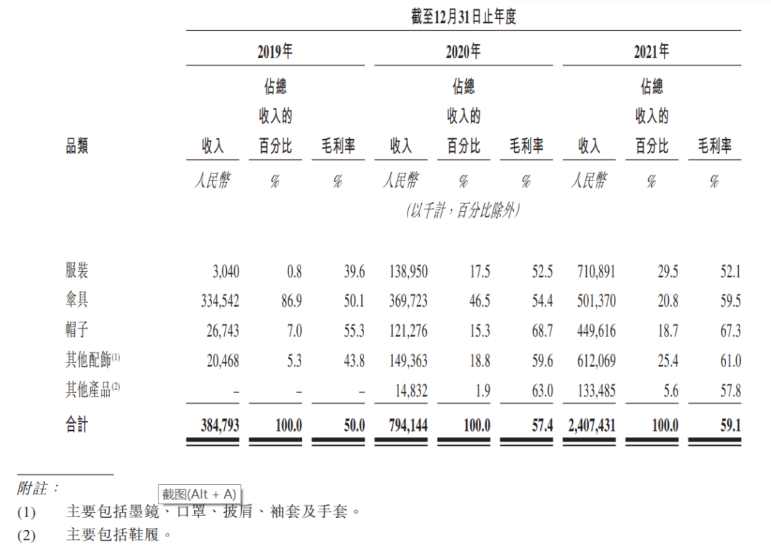 数据显示,2019-2021年,蕉下营收分别为3.85亿元、7.94亿元和24.07亿元,复合年增长率达150.1%,其中防晒类产品收入贡献率分别达99.2%、90.3%和79.4%。