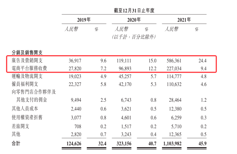 数据显示,2019年至2021年,蕉下分别录得净亏损2320万元、7.7万元及54.73亿元,直到2022年上半年才首度扭亏为盈,录得净利润4.91亿元,而2021年上半年同期亏损却达到了惊人的35.12亿元。亏损多半可以归结为高企的营销费用。招股书显示,2019年至2021年,蕉下分销和销售费用分别为1.25亿元、3.23亿元、11.04亿元,占营收为32.45%、40.7%和45.9%,其中广告及营销的开支分别为0.369亿元、1.19亿元、5.8636亿元,占比为9.6%、15%、24.4%。