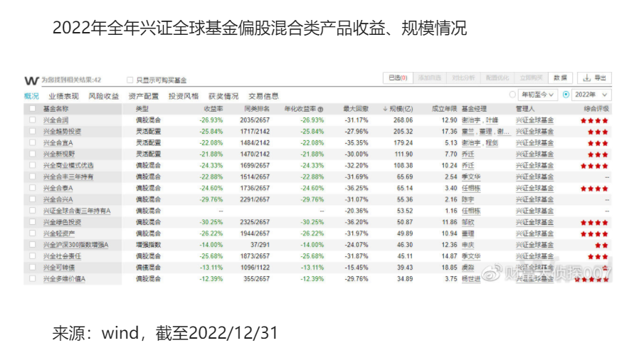 2022年,A股市场投资确实难做,沪深300指数全年跌幅20%,不少基金特别是权益类产品都出了回撤,规模大幅缩水。但谢治宇所在的兴证全球基金的混合型和股票型基金产品当年的收益率,确实不太好看。