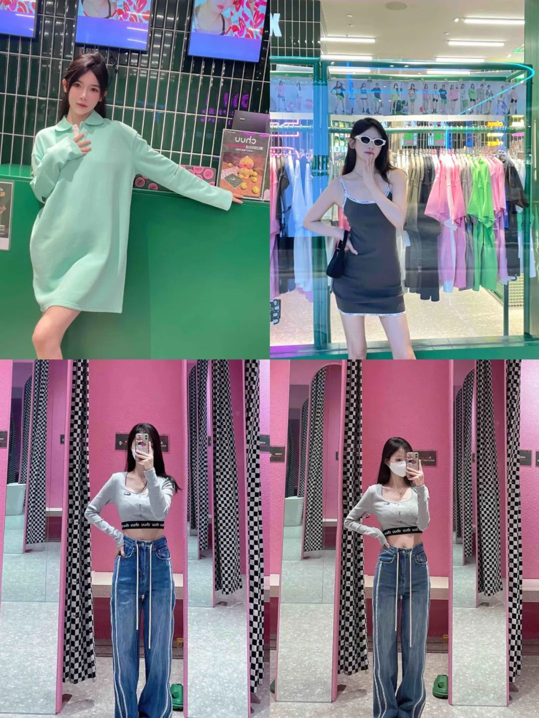 黄林以前只穿优衣库和ZARA的黑白灰,虽然Chuu价格亲民,单件均价二三百元,但对女孩的身材极度挑剔。彩虹色的吊带裙、青蛙绿的露脐装,并且这些衣服统一为小尺均码,只适合90斤上下、身高165以下的女生,她不确定自己能不能hold住。光是门头大面积的BV绿,店内墙壁布满耀眼的粉绿色霓虹灯阵,就能让人一阵眩晕。