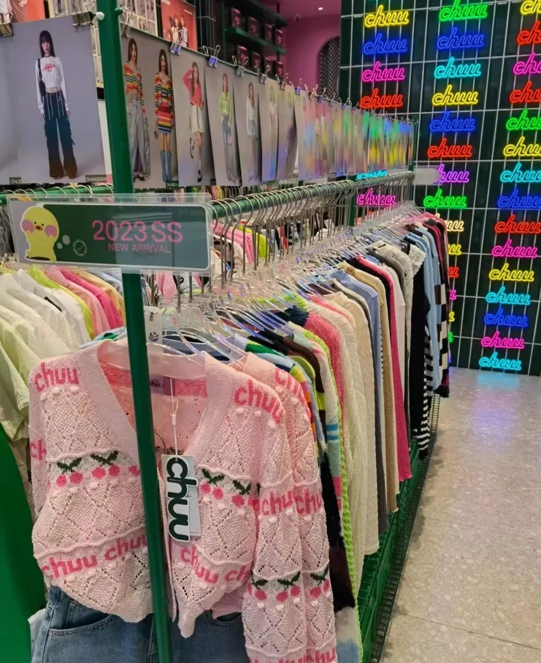 这里是名副其实的辣妹潮流聚集地,一排排荧光色的衣服让人眼花缭乱。抢眼的门店色彩组合,网红感十足的试衣间设计,Chuu稳稳拿捏住了年轻女孩的心思。