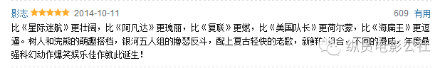 比《星际迷航》更壮阔,比《阿凡达》更瑰丽,比《复联》更燃,比《美国队长》更荷尔蒙,比《海扁王》更逗逼。树人和浣熊的萌趣搭档,银河五人组的撸瑟反斗,配上复古轻快的老歌,新鲜的组合,不同的漫威,年度最强科幻动作爆笑娱乐佳作就此诞生!@影志