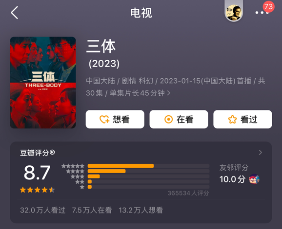 另一方面,《三体》用一份超出预期的高分答卷打开了国产剧的“科幻元年”,也把大众对《三体Ⅱ:黑暗森林》的期待值拉满了。换言之,豆瓣8.6无形中成为了《三体Ⅱ:黑暗森林》的品质底线。
