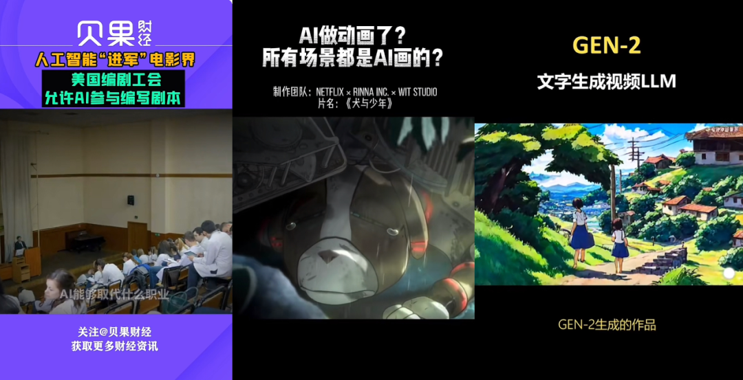 好莱坞方面,美国编剧工会拟允许编剧在AI协助下创作剧本,但禁止将AI作品视为原创素材;流媒体领域,Netflix公开了首部AIGC动画短片《犬与少年》;短视频这边,初创公司Runway发布文字生成视频模型Gen-2,“一句话拍大片”从梦想变为现实。