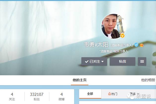 网络爆红之后,蓝瘦香菇小哥开通微博“韦勇V太阳”,新浪认证显示“蓝瘦香菇”视频当事人,并在当晚9点预告,自己次日在一直播平台的直播。短时间内,韦勇微博聚集了32万粉丝,并且粉丝数目还在不断上升,搭着这趟蓝瘦香菇的顺风车,韦勇一夜爆红。