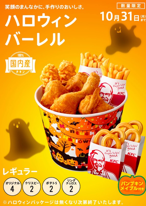 今年肯德基日本也推出了万圣节日桶,还有一个万圣节特别新品:环形Churros(西班牙油条,一种上面撒糖的油炸甜食)搭配南瓜酱,都是非常中规中矩又高热量的万圣节限定。感觉肯德基中国这次完胜日本团队了。