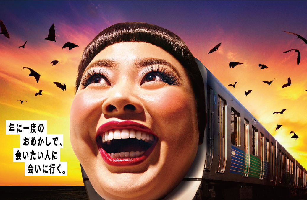 日本的西武铁道今年则邀请日本当红搞笑艺人渡边直美担任万圣活动代言,还把渡边直美的脸做成了3D版装饰在了车头。