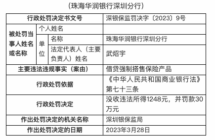 4月3日,深圳银保监局行政处罚信息公开表显示,2023年3月28日,珠海华润银行深圳分行因借贷强制搭售保险产品,被处没收违法所得1248元,并罚款30万元。黄锟对珠海华润银行深圳分行借贷强制搭售保险产品行为承担直接责任,受到警告处罚。