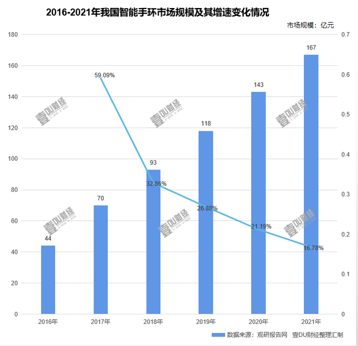 观研《中国智能手环行业发展趋势研究与投资前景分析报告(2022-2029年)》显示,2016年我国智能手环市场规模约为44亿元;2017年增长至70亿元;截至2021年,其规模更是增长至约167亿元。