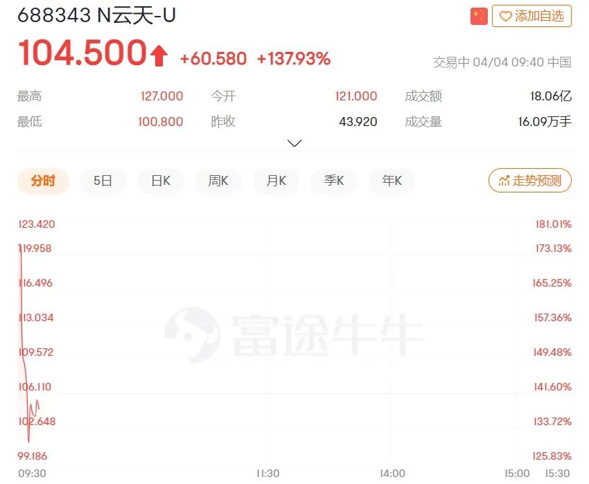 4月4日,云天励飞正式在科创板挂牌交易,证券代码688343。上市首日,这只独角兽在集合竞价阶段报121元/股,较发行价涨175.5%,总市值超400亿。开盘后,云天励飞高开后股价开始滑落,截至上午9时40分,云天励飞报104.5元/股,总市值为371亿元。