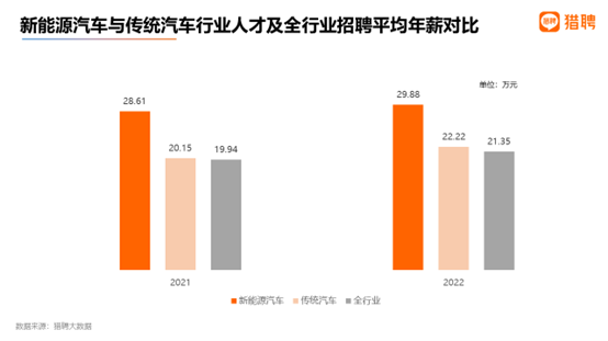 薪资方面,新能源汽车企业展现出强有力的竞争力,行业招聘平均年薪超28万,比传统汽车高出约8万元。2021、2022年,前者招聘平均年薪为28.61万、29.88万,比后者高8.46万、7.77万,两者均高于全行业平均水平。