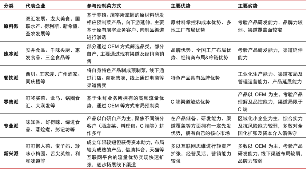 纵观目前预制菜企业的类型,主要有原料派、速冻派、餐饮派、零售派、专业派以及新兴派六大类型企业,它们参与预制菜的方式各不相同,同时又各有优劣。