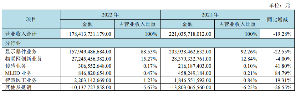 分产品来看,期内京东方A显示器件业务实现营业收入1579.49亿元,同比下滑22.55%,占总营收的88.53%。