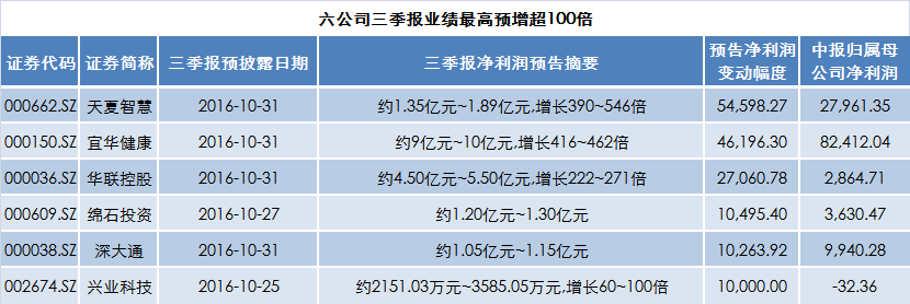 从业绩预告增速来看,预计三季度净利润增长超过10倍的公司有42家,其中6家业绩预告最高增速达100倍。这些公司分别是天夏智慧(000662.SZ)、宜华健康(000150.SZ)、华联控股(000036.SZ)、绵石投资(000609.SZ)、深大通(000038.SZ)和兴业科技(002674.SZ)。