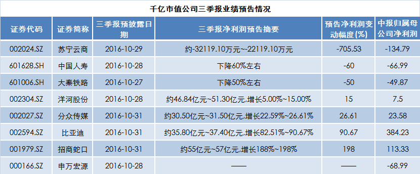 已披露业绩预告的大公司三季度有喜有忧。苏宁云商(002024.SZ)、中国人寿(601628.SH)、大秦铁路(601006.SH)业绩堪忧,这与这三家公司中报的趋势基本一致。招商蛇口(001979.SZ)、比亚迪(002594.SZ)、分众传媒(002027.SZ)则业绩向好。