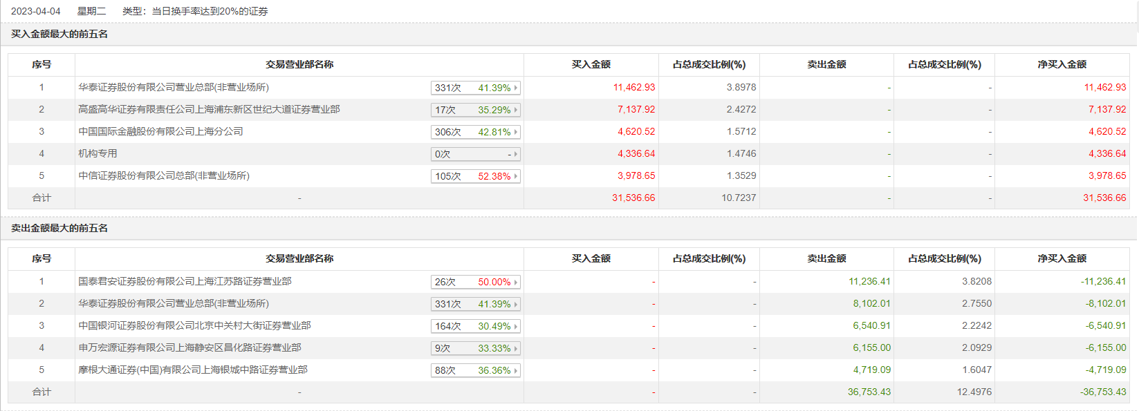 4月4日,剑桥科技今日涨停,龙虎榜数据显示,上榜营业部席位全天成交6.83亿元,占当日总成交金额比例为23.22%。其中,买入金额为3.15亿元,卖出金额为3.68亿元,合计净卖出5216.78万元。