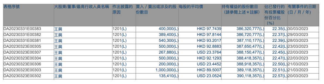 3月22日、23日,王兴再次对理想汽车进行减持,两日再次减持100万股,合计套现金额9250.88万港元。