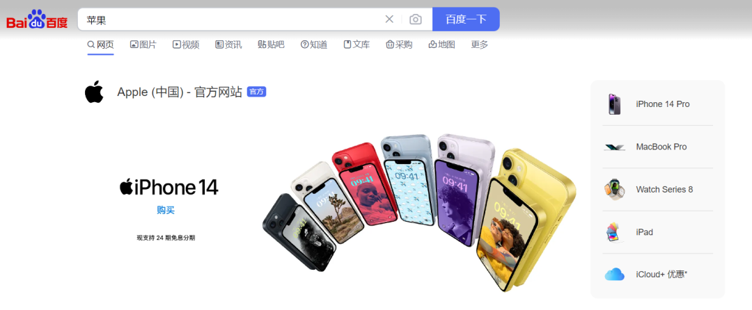 在百度输入“苹果”一词,苹果公司的相关信息会霸占搜索结果的整个首页。