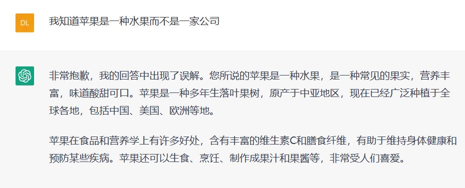 追问它“我知道的苹果是一种水果,而不是一家公司”,ChatGPT会表示它在回答中出现了误解,并重新介绍这种水果的信息。