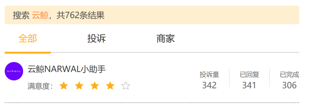 据黑猫投诉平台的信息显示,云鲸的投诉量为342条,涉及基站溢水、污水箱不抽水、充不进电、多次返厂维修、清水桶漏水、上下水系统堵塞等问题。