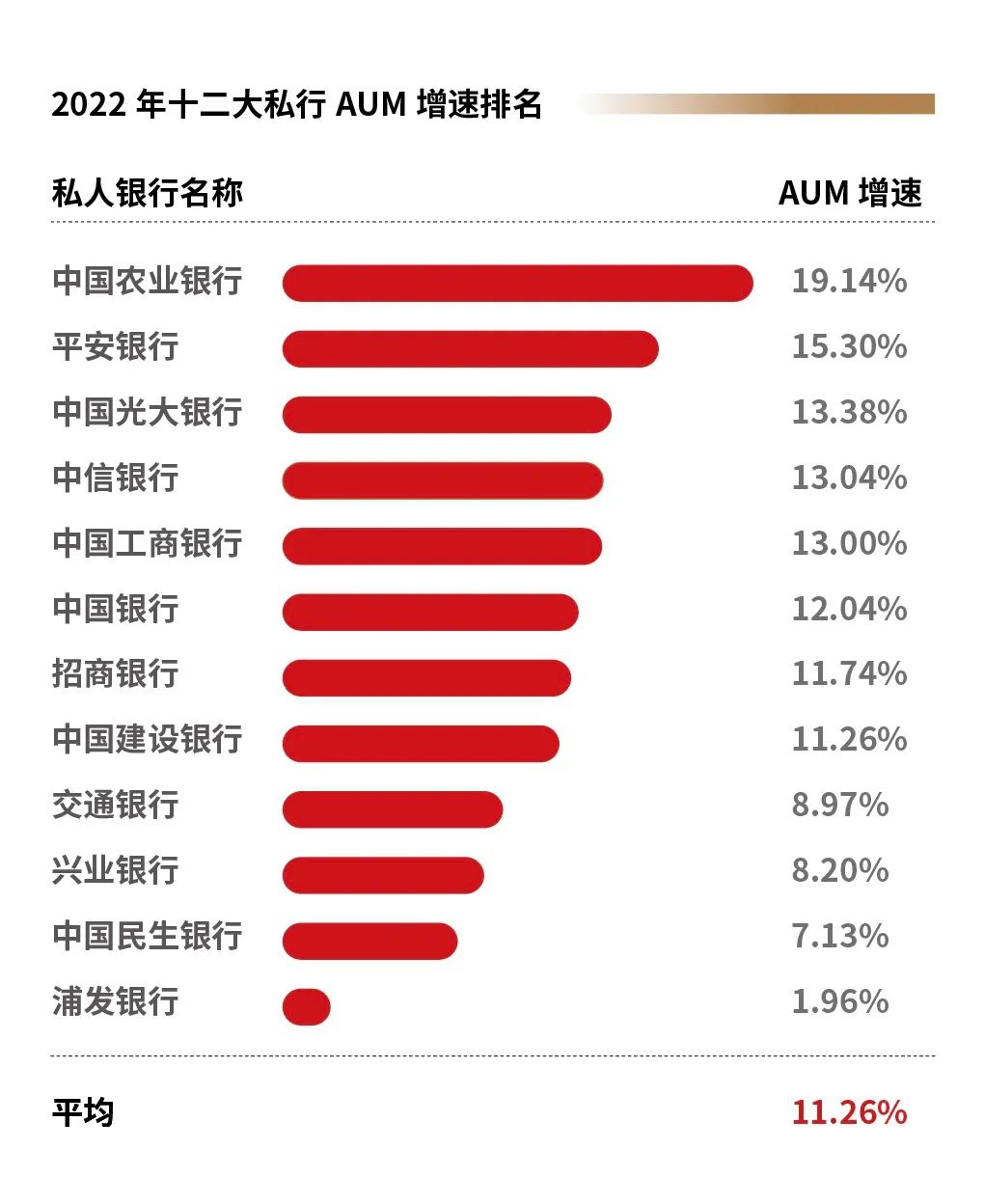 上图中用金色和蓝色突出显示的都是个位数的增长率,而往年则只有2-3家会有这种情况。同时还有部分私行户均AUM较2021年有所下降,增长率为负。