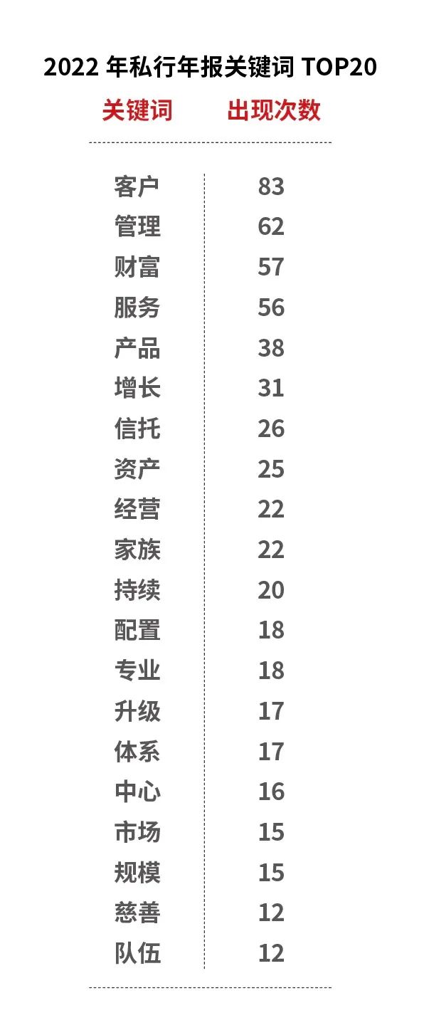 在私行2022年报关键词TOP20中,除“家族”之外,“慈善”出现的频率也较往年更高了。这说明在共同富裕背景下,私人银行逐渐成为了家族慈善服务提供商。