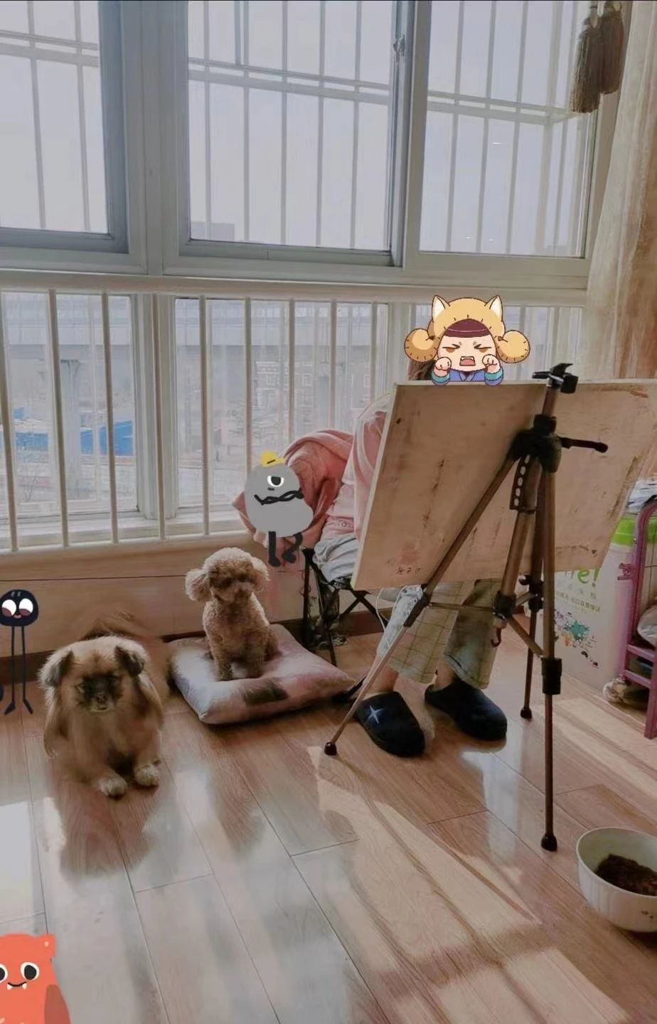 作为一位美术老师,肉包拳时常会回忆起那个阳光灿烂的午后:她在画架上画画,悠悠和另一只小狗萱萱不吵不闹,陪她作画。