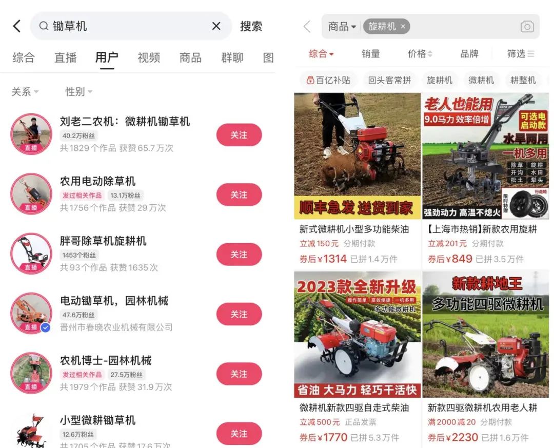 过去的三、四年间,新起的流量平台不断介入农机生意。一个直观的表现是,在拼多多、快手、抖音、视频号这些后起的线上流量平台上,农机的内容和相关交易变得越来越多。其中,在线上完成交易的多以锄草机、旋耕机等小型化且定价较低的农机、农具为主。