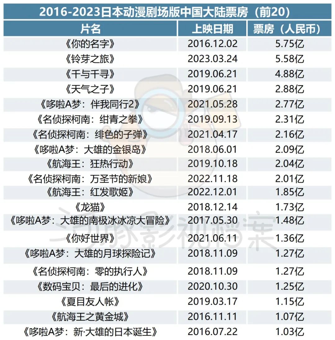 其一,转折点发生在2016年。2010年1月,《名侦探柯南:漆黑的追踪者》上映,那也是国内第一次引进《名侦探柯南》IP剧场版,票房仅为900万。直到2016年,《你的名字。》的5.75亿票房刷新了日本动画在中国影史的纪录,此外,同年上映的《航海王之黄金城》《火影忍者剧场版:博人传》《哆啦A梦:新·大雄的日本》也纷纷票房破亿。