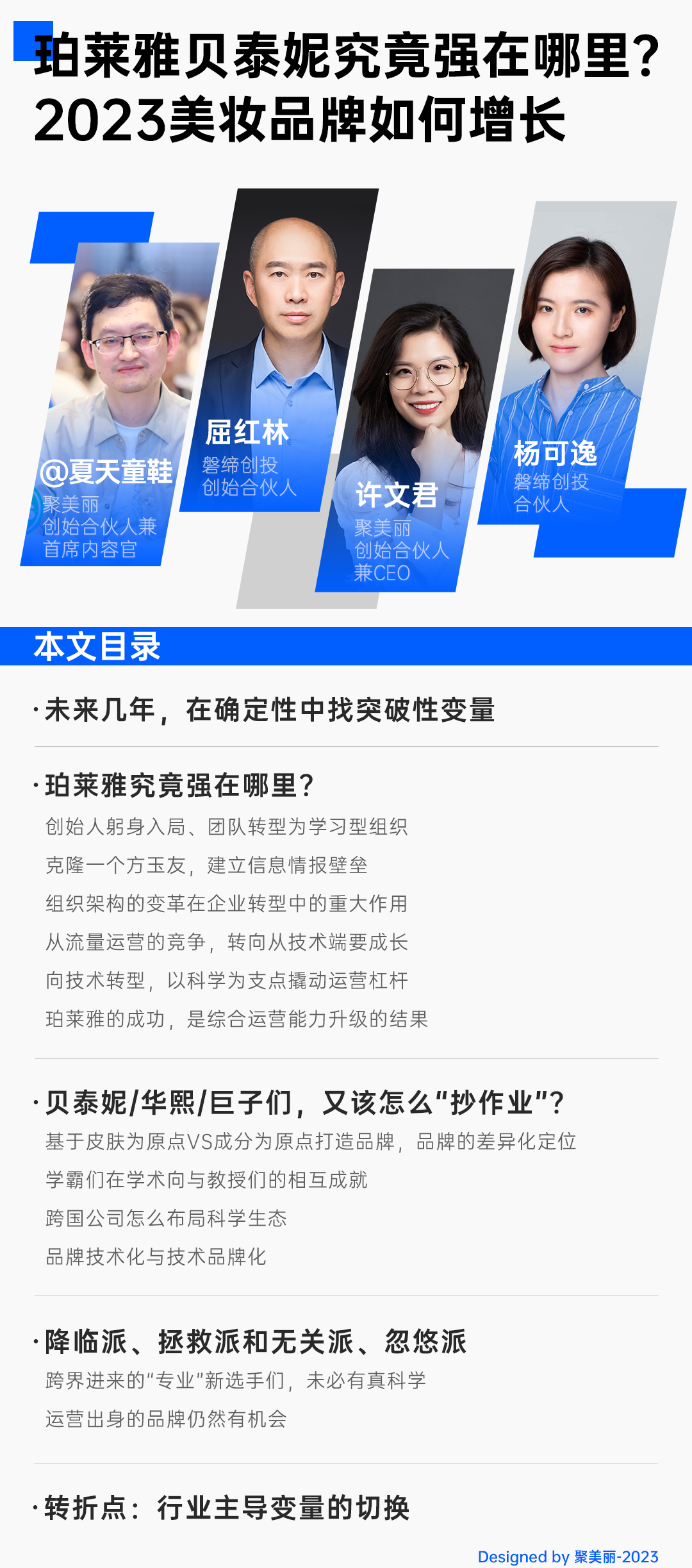 在聚美丽大会筹备期间,聚美丽两位创始合伙人许文君和@夏天童鞋请来两位老朋友,磐缔创投的屈红林、杨可逸,一起就2023年的美妆增长做了一场深度对话,作为有机会近距离观察四家头部企业的行业专家,对话披露了非常多首次公开的观点与洞察。