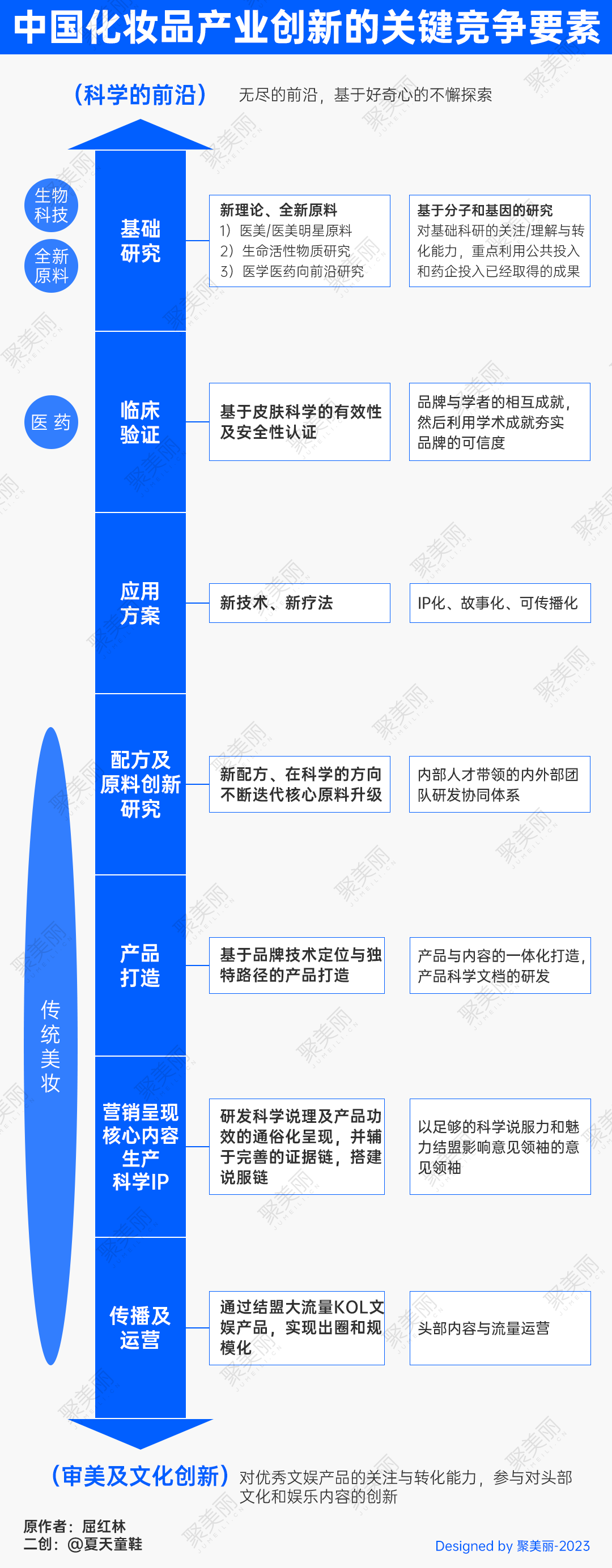 屈红林在聚美丽“科学品牌的春天·直播春鸣会”上,提出了化妆品产业创新的关键竞争因素,并认为传统美妆护肤品牌强在营销呈现和传播运营端,而医疗等上游技术端进入的选手往往在基础研究、新技术新疗法的应用方案上有天然优势,而整个产业竞争的关键要素正在往上游转移。