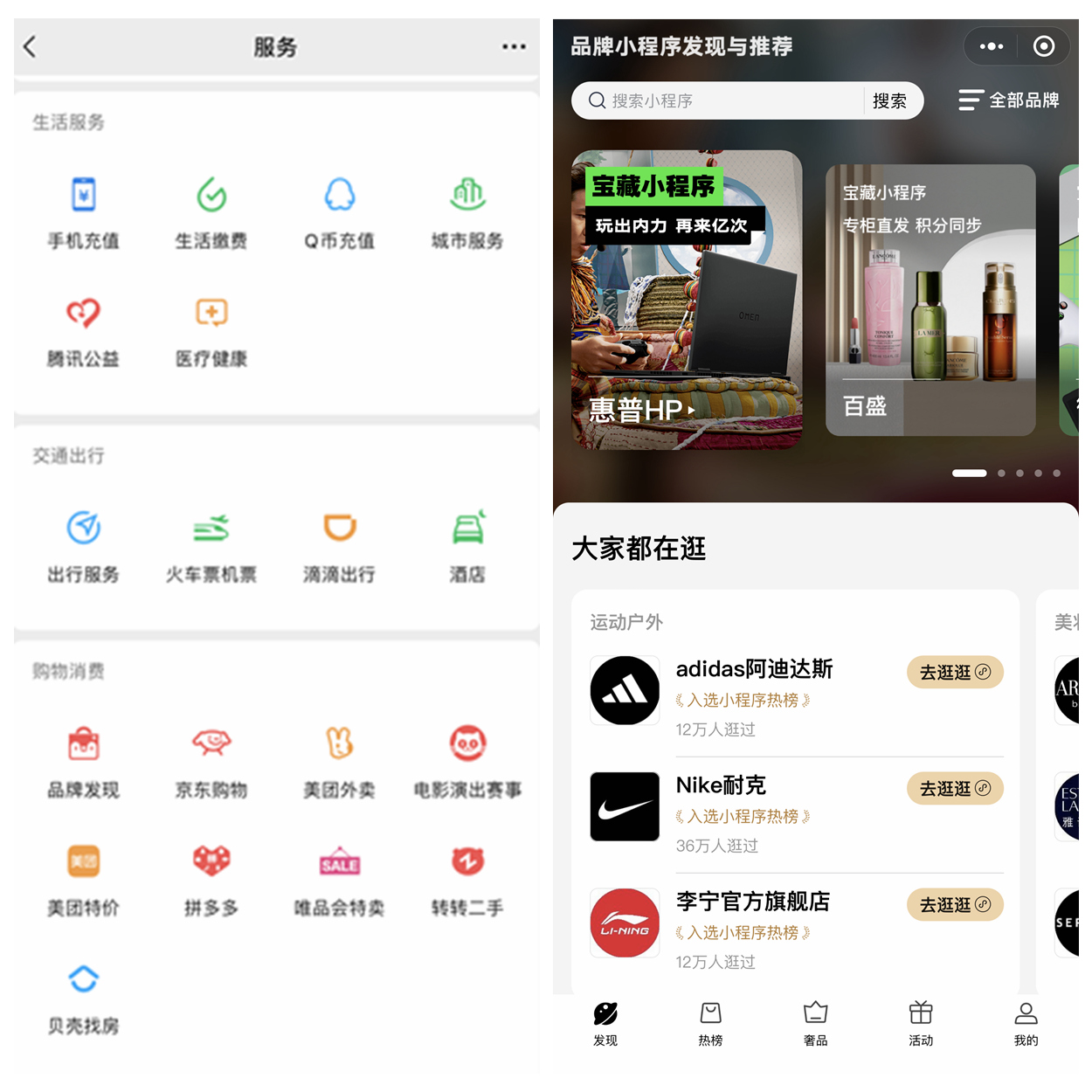 腾讯惠聚微信小程序上线于2020年12月,主打品牌商品,走的是和小鹅拼拼相反的高端路线,微信用户可直接在商城页面选购下单。后腾讯惠聚于2022年9月更名为腾讯荟聚,腾讯荟聚又于2023年2月更名为品牌发现,定位从品牌商城调整为品牌小程序发现和推荐平台。目前品牌发现占据了微信服务入口“购物消费”类目九宫格第一位置,已不再具备购物功能。