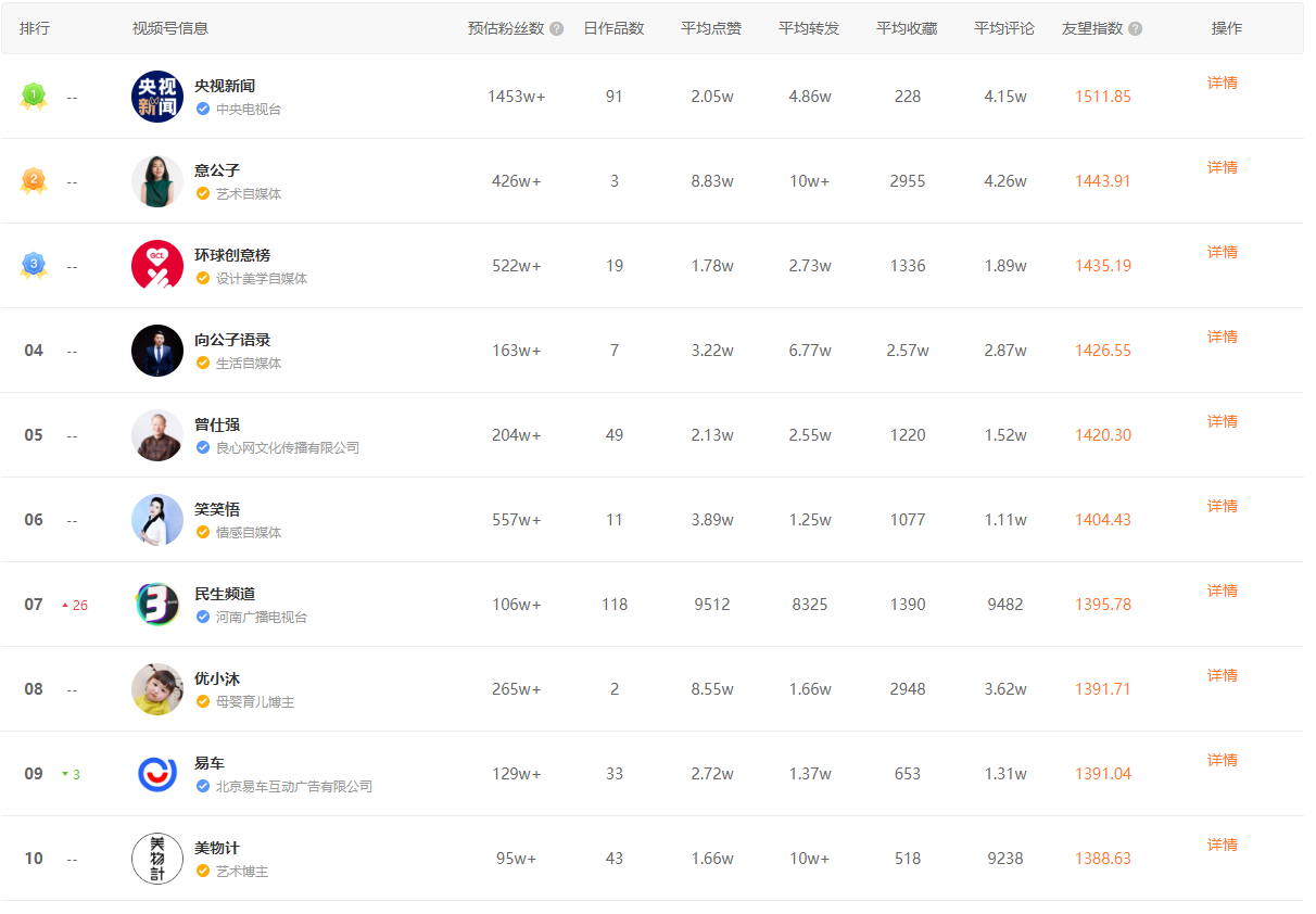 由视频号数据分析平台友望数据所做2023年3月视频号月榜TOP10榜单可见,目前视频号生态里关注度较高的账号类型是新闻资讯、艺术设计、生活情感等。以仅次于央视新闻而位列榜单第二名的“意公子”为例,这个由前厦门卫视主持人吴敏婕于2021年2月注册的艺术类视频号现已发布短视频200多条,收获10万+爱心是常态,评论区也十分活跃,但该成绩一如其名次,在视频号生态里并不多见。