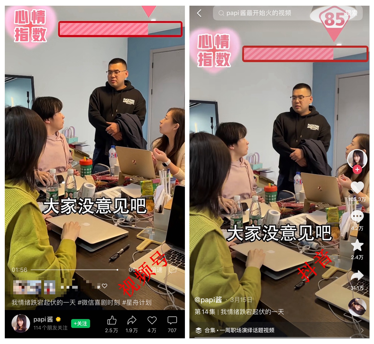 2023年3月15日,papi酱在抖音、视频号等多平台发布了作品《我的一天心情指数》。这条短视频主要讲述的是某个工作日,一位白领面对职场各种出乎意料的事,心情跌宕起伏的经历。尽管作品活泼生动,颇戳中白领笑点,但这里面不乏对客户、老板的吐槽,还有屎尿屁等一些不很高级趣味的梗,可以想见用户对点赞转发该类短视频的犹豫心理。目前该条内容的抖音和视频号的反馈是数量级的差距:抖音获赞逾105万,评论4.2万;视频号获赞即爱心数量4万,评论707。