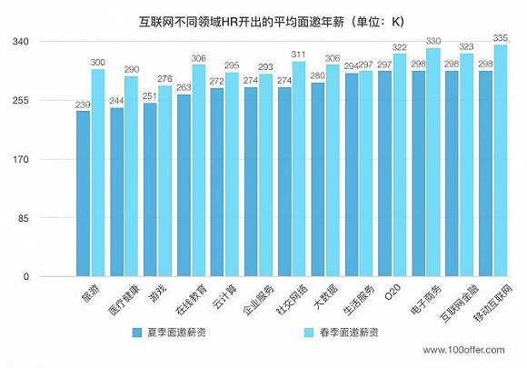 根据100Offer的最新报告,2016年夏季,各领域互联网企业给候选人开出的平均面邀年薪主要在23万到30万之间,其中移动互联网、互联网金融和电子商务三个领域的互联网公司员工薪酬水准较高。