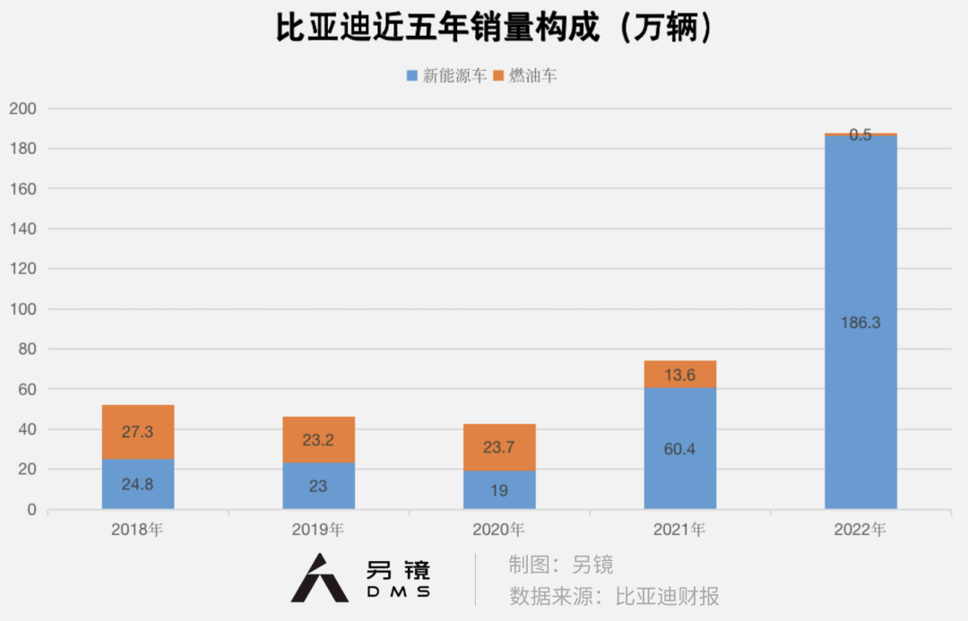 2022年比亚迪全年共销售186.35万辆新能源汽车,同比增长208.64%。