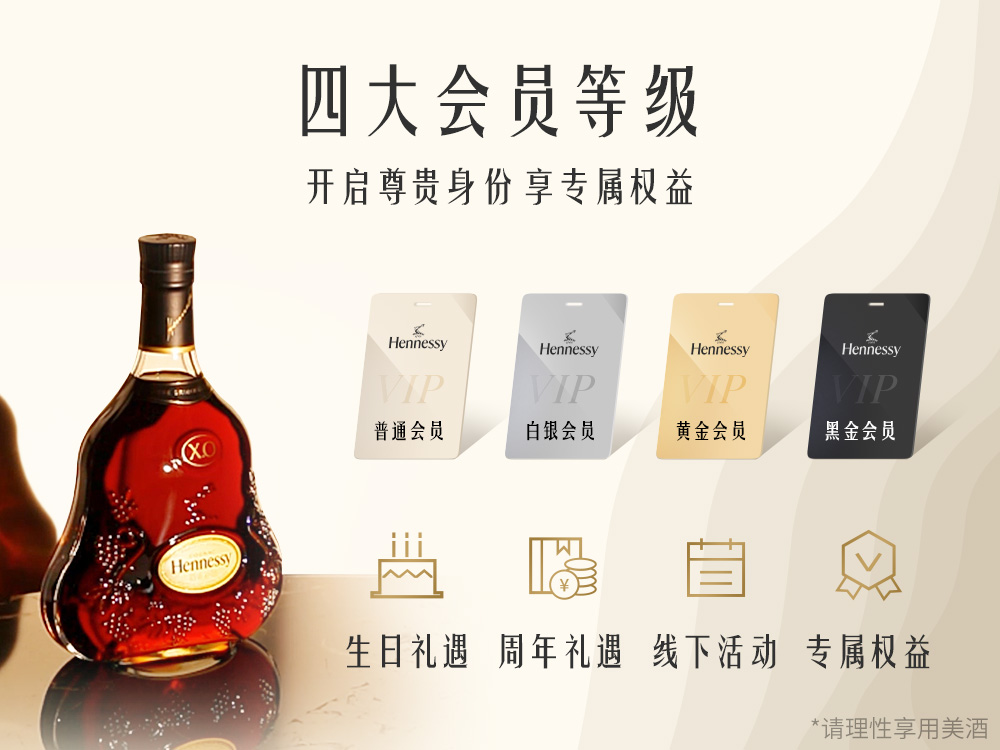 2023年3月1日,轩尼诗挚樽会商城正式在小程序上线,与此同时,轩尼诗挚樽会商城的四大等级体系包含普通会员、白银会员、黄金会员、黑金会员也于同日上线。通过深入布局数字化的消费场景,呈现更多臻选佳酿和便捷服务,打造会员尊享线上消费体验。如今,轩尼诗挚樽会小程序承载了线上商城、会员体系、品牌宣推等多方位的功能。轩尼诗旗下产品——轩尼诗X.O、轩尼诗詹姆士、轩尼诗V.S.O.P、轩尼诗X.X.O和轩尼诗新点的甄选干邑均可于小程序中的线上商城直接购买,为用户深入打造了更加完整和丰富的线上体验。