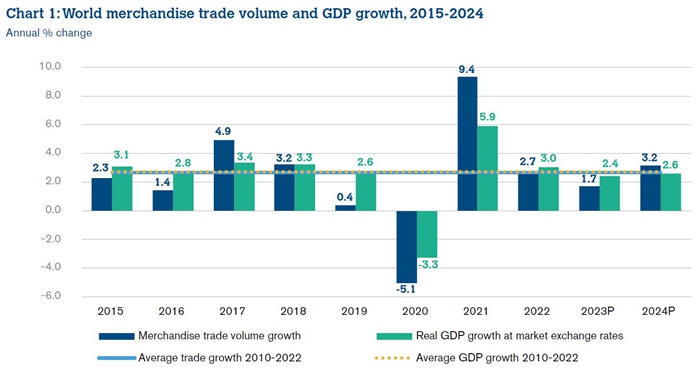 对于2024年,WTO报告认为由于GDP增速上涨,预计全球商品贸易将增长3.2%。该机构预计明年全球GDP增速为2.6%,今年为2.4%。