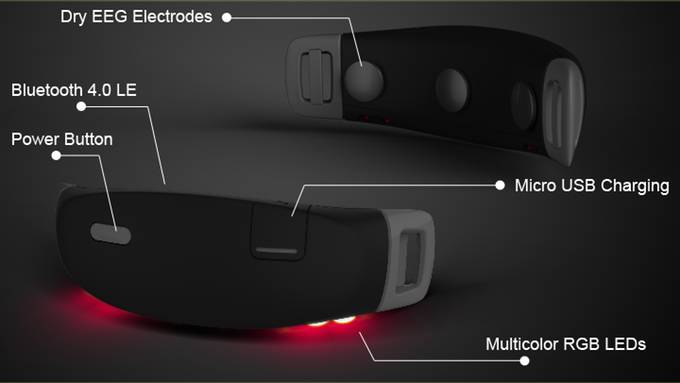 头带内侧设置有三个干性脑电监测电极,靠近眼睛的底部有多色LED,使用蓝牙4.0与智能设备连接,并有一个USB充电口。