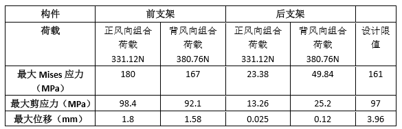 最后对构件进行受力分析,主要分析其最大应力,最大剪应力以及最大变形量。同样可以得出构件满足设计要求。并分析了前支架超过设计限值的情况只有在极端荷载情况下前支架单独受到组件作用才会出现,而这种情况下并不会使结构出现断裂,支架可靠性可以保障。