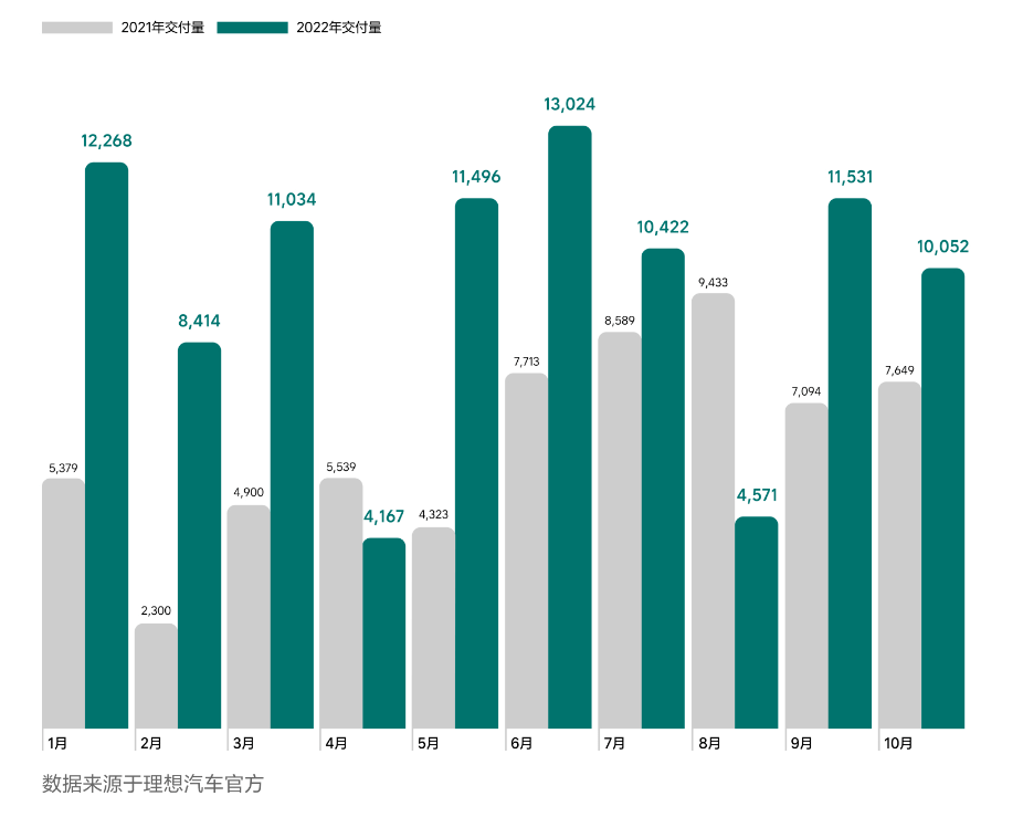 在2022年10月之前,理想仅凭一辆六座家庭用车——理想ONE,就征服了20万车主。在理想汽车官方网站关于交付量的说明上,自2019年至2022年10月,理想已为22万家庭提供了交付服务。这其中90%的成绩都离不开立首功的理想ONE,理想ONE在2022年未停产的前8个月里,做到了每月销售过万的亮眼成绩。随后,理想ONE突然停产,市场一片哗然。理想立即推出升级版的三款L车型,才逐渐平息各方声音。